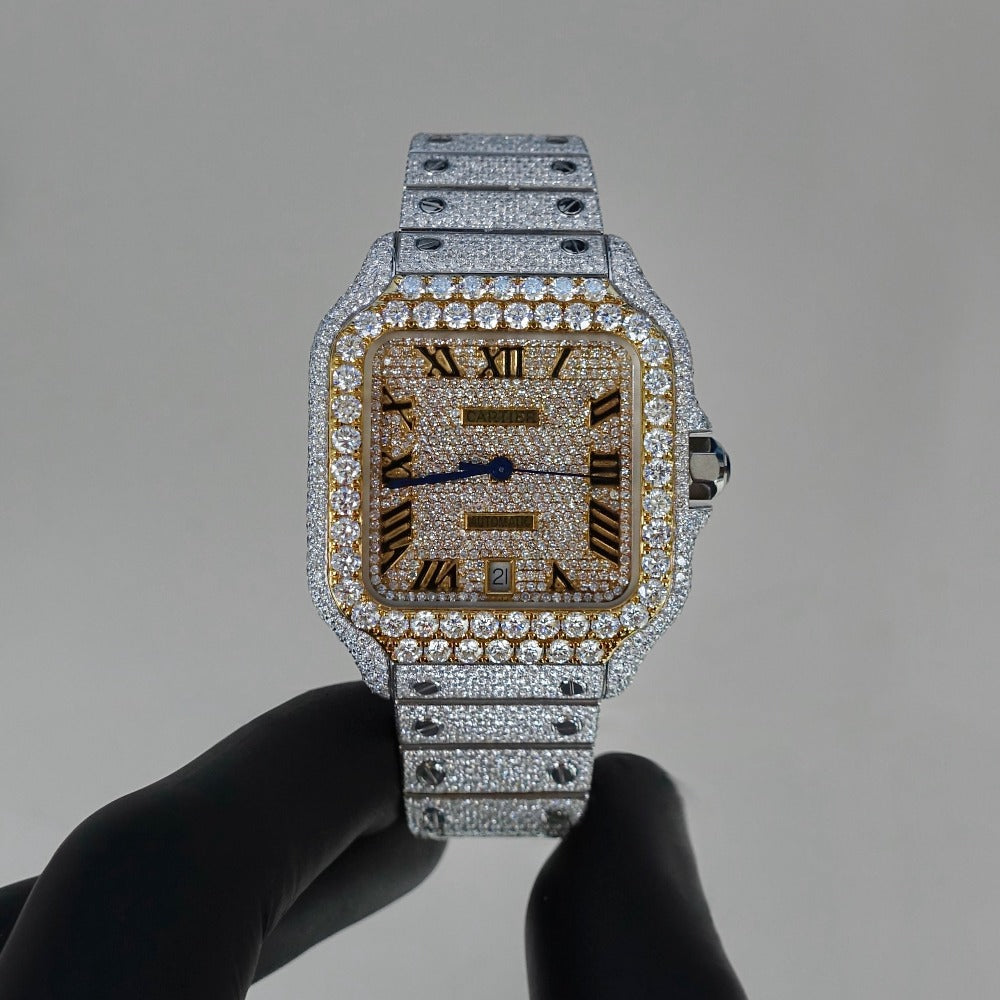 Discover our stunningΒ Diamond Cartier Santos 40mmΒ inΒ Steel &Β 18kΒ Yellow Gold. ThisΒ Iced OutΒ CartierΒ is flawlessly diamond set with over 2900 diamonds, for a carat weight of 24 carats of VS diamonds. The craftsmanship is at its finest on thisΒ CartierΒ diamond watch, with a splendid flowersetting, making it fully covered of diamonds, without any visible gap or metal parts.