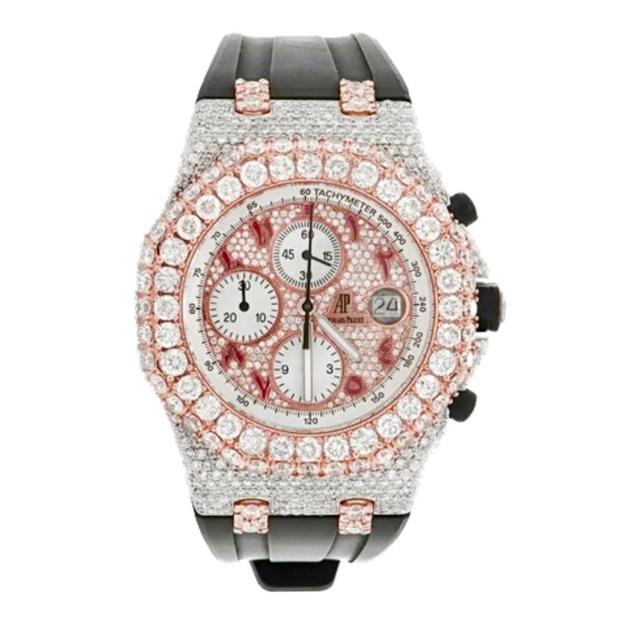 Discover our stunning DiamondΒ Audemars Piguet Royal OakΒ Offshore Chronograph 42mmΒ in Stainless Steel & 18k Rose Gold. ThisΒ Iced OutΒ APΒ is flawlessly diamond set with over 1300 diamonds, for a carat weight of 22 carats of VVS diamonds. The craftsmanship is at its finest on thisΒ APΒ diamond watch, with a splendid flowersetting, making it fully covered of diamonds, without any visible gap or metal parts.